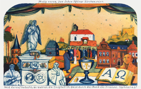 "Mutig voran. 200 Jahre Pfälzer Kirchenunion", Farbradierung von drei Platten, Plattengröße 23 cm x 33 cm, Papierformat 40 cm x 50 cm, Auflage 180 Exemplare