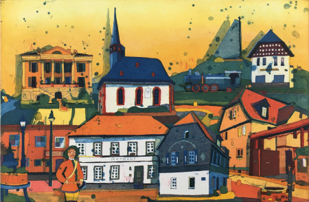 Rennerod, Farbradierung von drei Platten, Bildgröße 21,5 cm x 33 cm, Papierformat 40 cm x 50 cm, Auflage 50 Exemplare