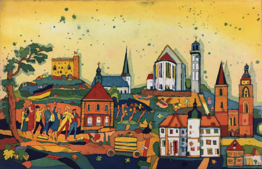 "Idstein", Farbradierung von drei Platten, Plattengröße 21,5 cm x 33 cm,